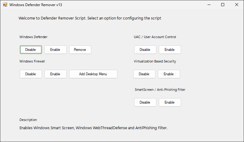 This application is removing / disables Windows Defender , including the Windows Security App, Windows Virtualization-Based Security (VBS) , Windows Smart-Screen, Windows Security Services , Windows Web-Threat Service and Windows File Virtualization (UAC) and Microsoft Defender App Guard.