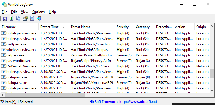 WinDefLogView is a tool for Windows 10 and Windows 11 that reads the event log of Windows Defender (Microsoft-Windows-Windows Defender/Operational) and displays a log of threats detected by Windows Defender on your system. For every log line, the following information is displayed: Filename, Detect Time, Threat Name, Severity, Category, Detection User, Action, Origin, and more...