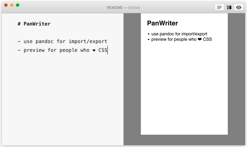A distraction-free markdown editor with tight integration with pandoc for import/export to/from plenty of file formats, as well as a preview pane that can show pages.
