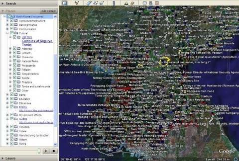 Ein Layer für Google Earth markiert hunderte von Orten in Nordkorea - von Sehenswürdigkeiten über die Residenzen des Staatschefs bis hin zu den Straflagern. Der Herausgeber bezeichnet das von Internetnutzern zusammengetragene Material als demokratisierte Geheimdienstinformationen.