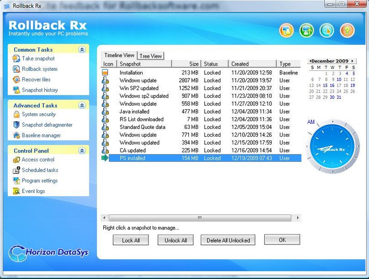 RollBack Home Edition is a FREE instant time machine for your windows workstation. It is a comprehensive Windows System Restore solution that empowers users and IT administrators to easily restore their PC's to any previous state within seconds. RollBack Home Edition helps users better manage and lockdown Windows based PC's. Any unforeseen incidents such as user errors, viruses or even botched software installations can be instantly reversed in seconds!
