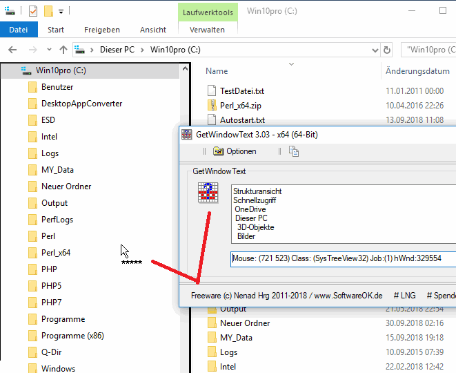 Unterstützt werden auch Verzeichnisbäume (SysTreeView32) und Listenansichten (SysListView32), hier wird der komplette Inhalt ausgelesen. Beim Loslassen der Maustaste wird das Auslesen beendet.
