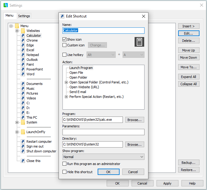 New feature: It is now possible to edit menu items by pressing F2 key in Settings window