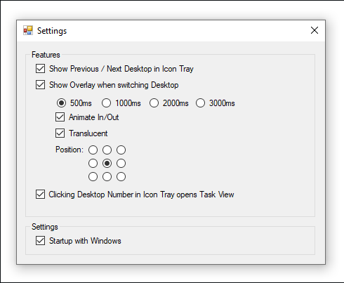 Windows Virtual Desktop Helper will display which desktop you are on when switching. Windows Virtual Desktop Helper helps fix some of these missing features. Once in use, you can right-click a virtual desktop number and access settings. From there, you can show the previous/next desktop icon in the systray, an overlay when switching between your active desktops, and startup with Windows. You can also opt to change the overlay duration, animation in/out, and the position of that overlay.
