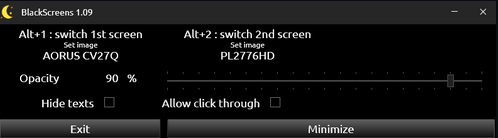 BlackScreens is a Windows 10/11 Application that let you darken any of your current screen with simple keyboard shortcut switch: Alt+1 --> Alt+6 Alt+0 to switch all screens at once