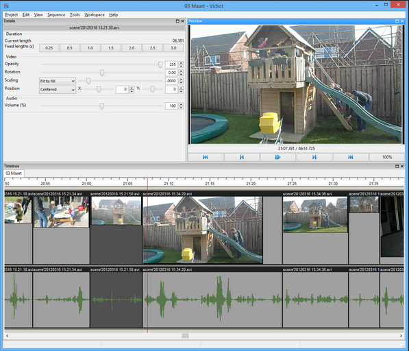 Vidiot is a non-linear video editor targeted for home video editing. It supports operations like compositing, scaling/rotating, adding transitions, trimming, etc.