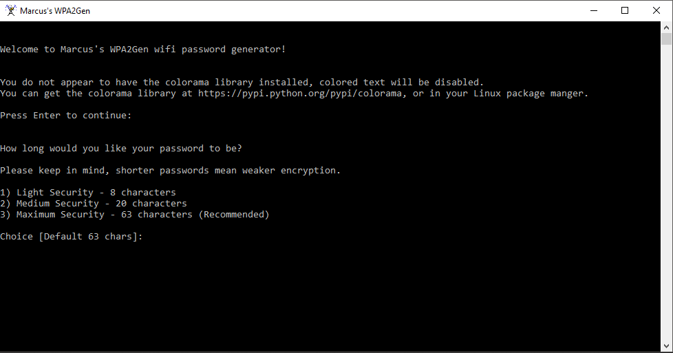 WPA2Gen is an Open Source, Command Prompt Wi-Fi password generator written in Python for Windows and Unix systems.