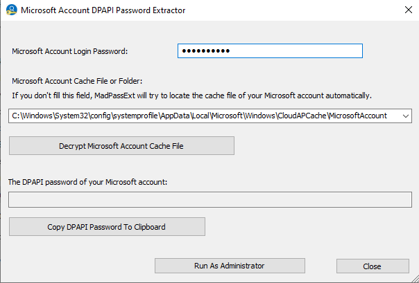 This tool allows you to decrypt and extract the secret DPAPI password generated for your Microsoft account when using it to log into Windows 10 or Windows 11. After you retrieve this DPAPI password, you can use it to recover passwords encrypted with DPAPI from external hard drive, as long as they were encrypted with the same Microsoft account.