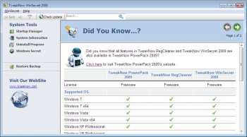 TweakNow WinSecret is a powerful registry editor. As a long time Windows user you might have heard about registry. The registry is a special file in your hard disk that hold most of Windows settings data. Wish to improve your internet speed or display message at Windows logon? No problem, those tasks can easily be done by simply editing the registry value. In TweakNow WinSecret, we have gathered the most popular Windows XP/Vista/7 registry settings and provide them for you in an easy and safe user interface.