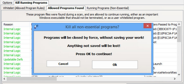 KillEmAll is a ‘panic’ button with an ‘ask questions later’ attitude, designed to neutralize, terminate, and later identify all non-essential running programs. Great for quickly closing unwanted apps, system inspection, and even malware removal!