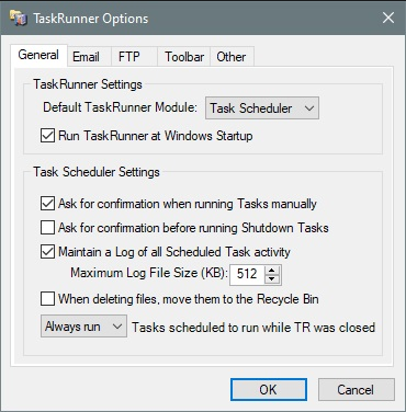 Instead of having multiple memory-draining programs running you can slim down and enjoy the benefits of a single program to run your common daily activities. TaskRunner can easily be set up to run an executable or open a particular file, backup files locally or to an FTP server, delete files locally or on an FTP server, download files from a website as well as perform a system cleanup - delete temp internet files, desktop files/icons, recycle bin items. You also have the ability to monitor local or remote machine processes and services, receive email reminder notifications, send emails (with optional attachments) and ping an IP address. Forget to logoff at the end of the day? No problem. TaskRunner can log off, enter standby, restart, or shutdown your PC.