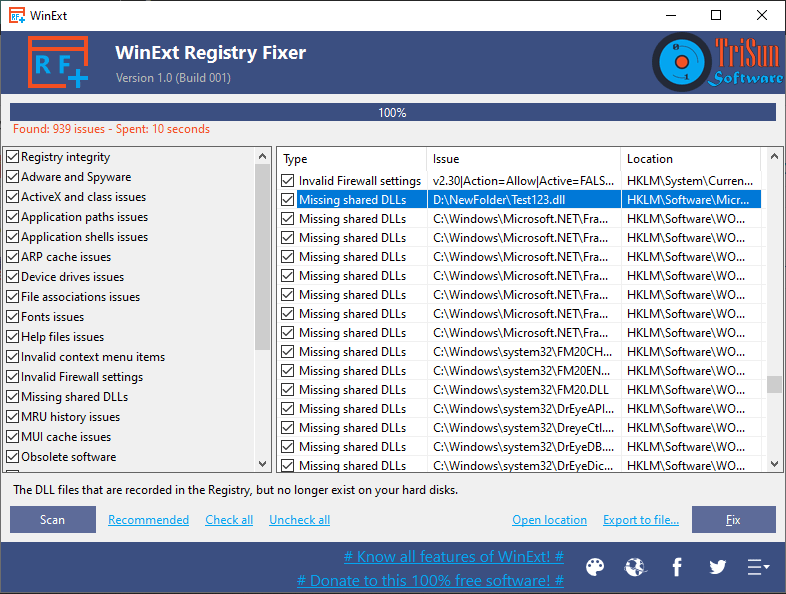 WinExt Registry Fixer is a 100% FREE Windows Registry repairer / cleaner. It can keep your PC at better performance by fixing Registry issues and cleaning Registry junk.