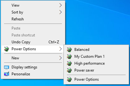 SwitchPowerScheme is a utility for changing power plans via the right-click context menu. The ability to change plans on-the-fly makes the process as simple as possible, no need to navigate to the control panel, etc., as everything you need is right there ready to deploy.