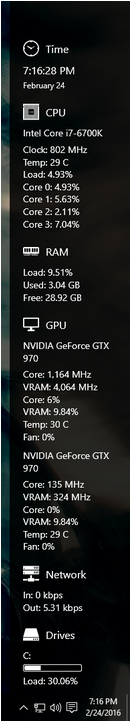 Sidebar Diagnostics allows you to easily customize what information is displayed as well as what order they appear - this is nice if you are wanting to pay attention to certain areas while you're working. You set up alerts for temperature which can be set for your CPU and GPU or bandwidth if you choose.