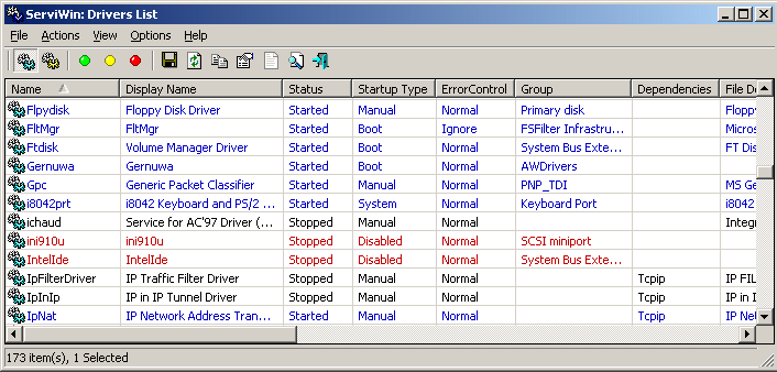 In addition, ServiWin allows you to easily stop, start, restart, pause, and continue service or driver, change the startup type of service or driver (automatic, manual, disabled, boot or system), save the list of services and drivers to file, or view HTML report of installed services/drivers in your default browser.