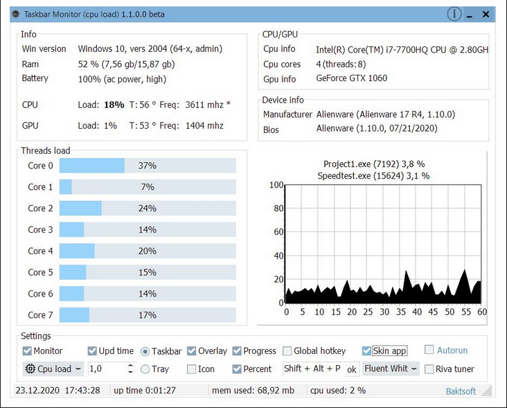 TaskBar Monitor can provide details about the load/temperature of your machine's central processor, loading/temperature of the graphic card (Nvidia cards), RAM/available free space, battery level/condition, operating system information, CPU core(s) load, BIOS/manufacturer, and a graph of CPU load and top loading processes.