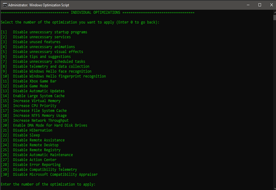 Windows-Optimizer is a batch script designed to help users optimize their Windows 10 system for their specific needs. This script provides various optimization presets to choose from, including General Optimization, Gaming Optimization, Network Optimization, High Performance Optimization, Low End PC Optimization, Privacy Optimization, Office Productivity Optimization, Creative Work Optimization, Developer Optimization, and Power Saver Optimization.