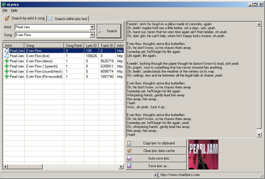 sLyrics allows the search and download of song lyrics from a broad database of songs. The program also allows search inside lyric text.