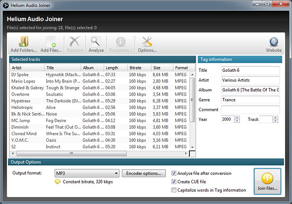 Helium Audio Joiner is a free, fully functioning, helper application that enables you to join multiple audio files into one single file. It will also give the users the possibility to analyse their files for errors, both before and after the joining as well as create CUE files from the joined audio data. It supports a wide list of audio formats to create from and to and comes with an easy configurable user interface.