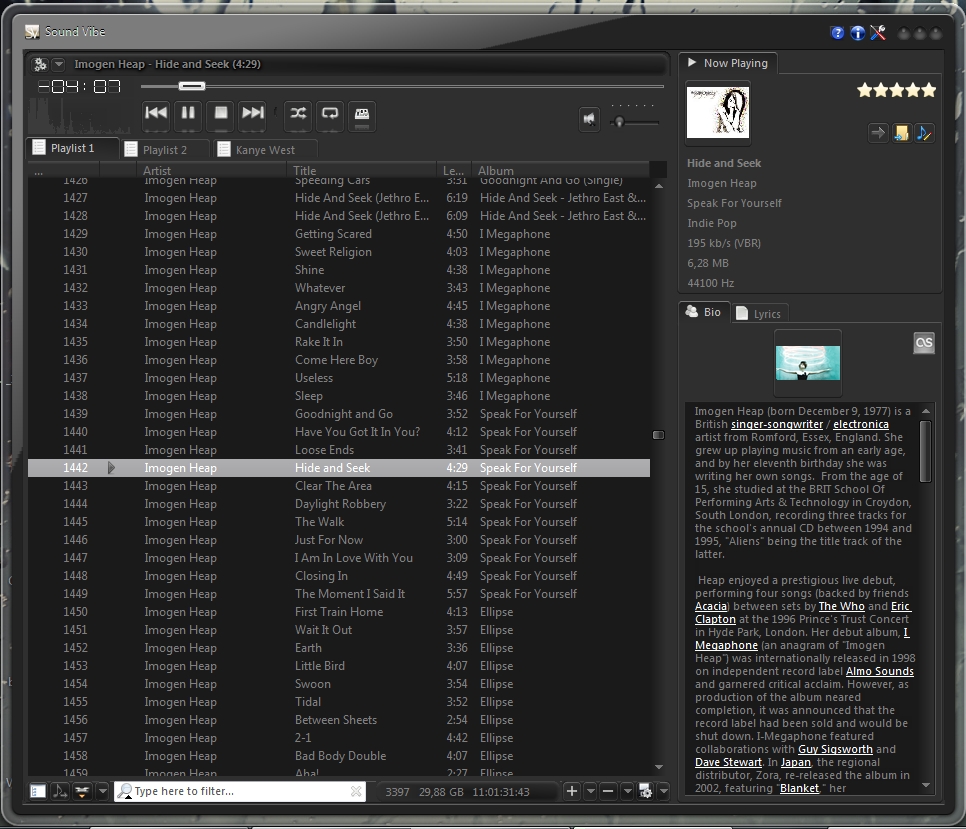 Sound Vibe is a powerful freeware audio player for PC. Some of the basic features include supporting a huge variety of different audio formats, full unicode support, multiple hierarchical playlists, media library with advanced directory monitor, ability to download album covers from the internet, last.fm scrobbler, queue manager, audio converter/ripper, etc.