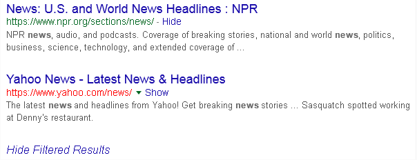 Google Search Results Filter will display a Hide or Show link next to the domain name of a search result. The domain name of a filtered search results will appear red. If any of the search results get filtered, then a Show Filtered Results link will appear at the bottom of the page. A full list of active filters can be found in the extension's options.