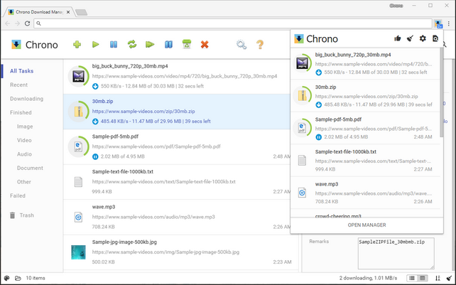 Chrono Download Manager is the first (and only) full-featured download manager that's designed exclusively for Google Chrome. All your download managements are done inside the browser, instead of a separate download managing application. Chrono is tightly integrated with Chrome by context menus, toolbar buttons and keyboard shortcuts.