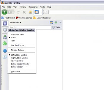All-in-One Sidebar (AiOS) is a sidebar control, inspired by Opera's. Click on the left edge of your browser window to open the sidebar and get easy access to all your panels. It lets you quickly switch between sidebar panels, view dialog windows such as downloads, add-ons, and more in the sidebar, or view websites in the sidebar. It includes a slide-out button and a toolbar, all of which can be extensively customized. All-In-One Sidebar provides also enhancements for many built-in and extension features and some extra features.