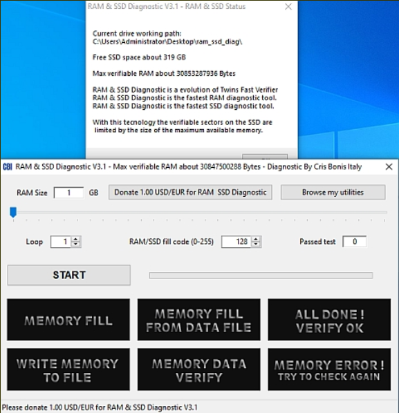 This simple tool will help in error verification by filling the available RAM with value and then copying this RAM to SSD. The cells written to the file are then copied back into the RAM - this completes the verification. The file generated on the SSD is automatically deleted after running the verification. On the first run, it will provide you with some system stats within a pop-up window showing the current drive, total system-wide RAM, and free physical RAM.