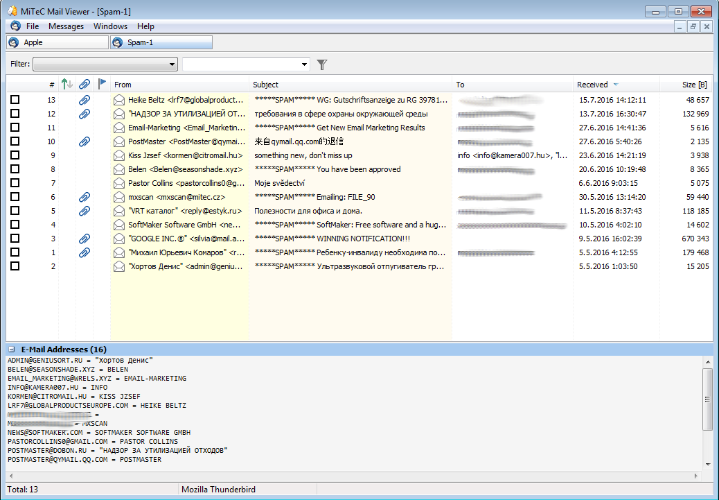 MiTeC Mail Viewer for Outlook Express, Windows Mail/Windows Live Mail and Mozilla Thunderbird message databases as well as single EML files. It displays list of contained messages with all needed properties as ordinary e-mail client. Message can be viewed in detailed view including attachments (save ability) and HTML preview. It has searching and filtering capability and also allows to extract all email address from all emails in opened folder to list by one click. Selected messages can be saved to *.eml files with or without their attachments. Attachments can be extracted from selected messages.